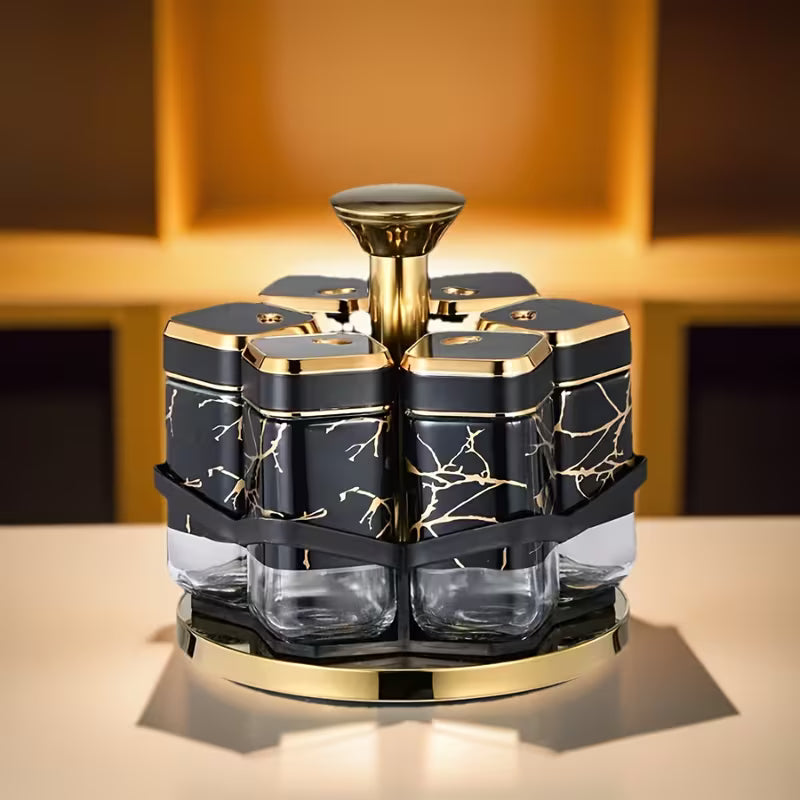 The Spice Carousel is a stylish and practical kitchen organizer designed to keep your spices neatly stored and easily accessible. Featuring a smooth 360-degree rotating base and elegant glass jars, it allows you to quickly find and use your favorite seasonings while cooking. Its modern design adds a premium touch to any kitchen countertop.