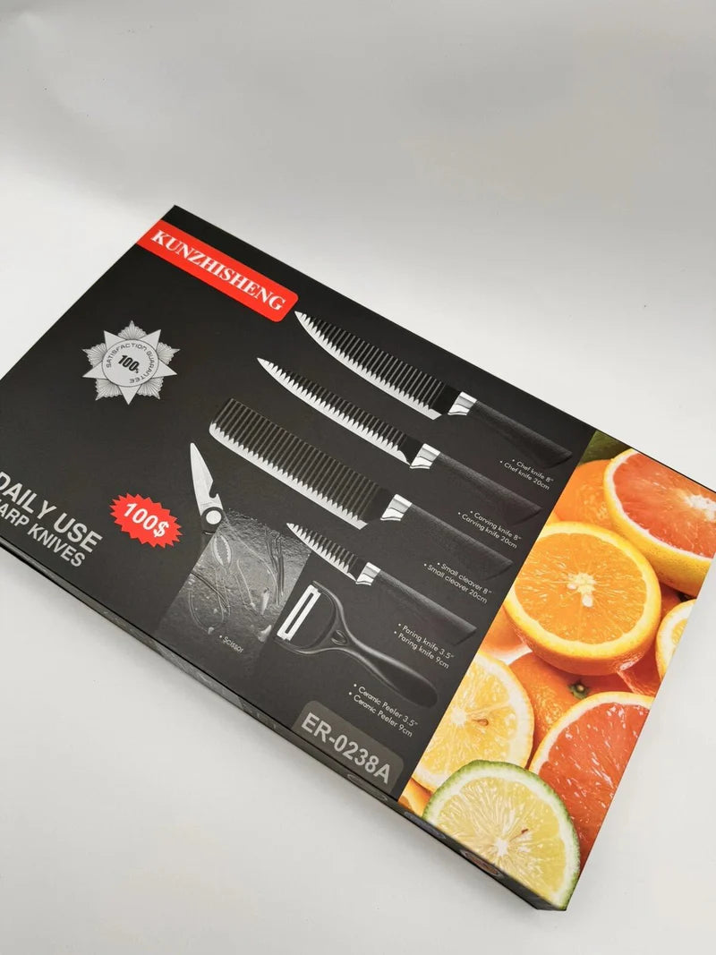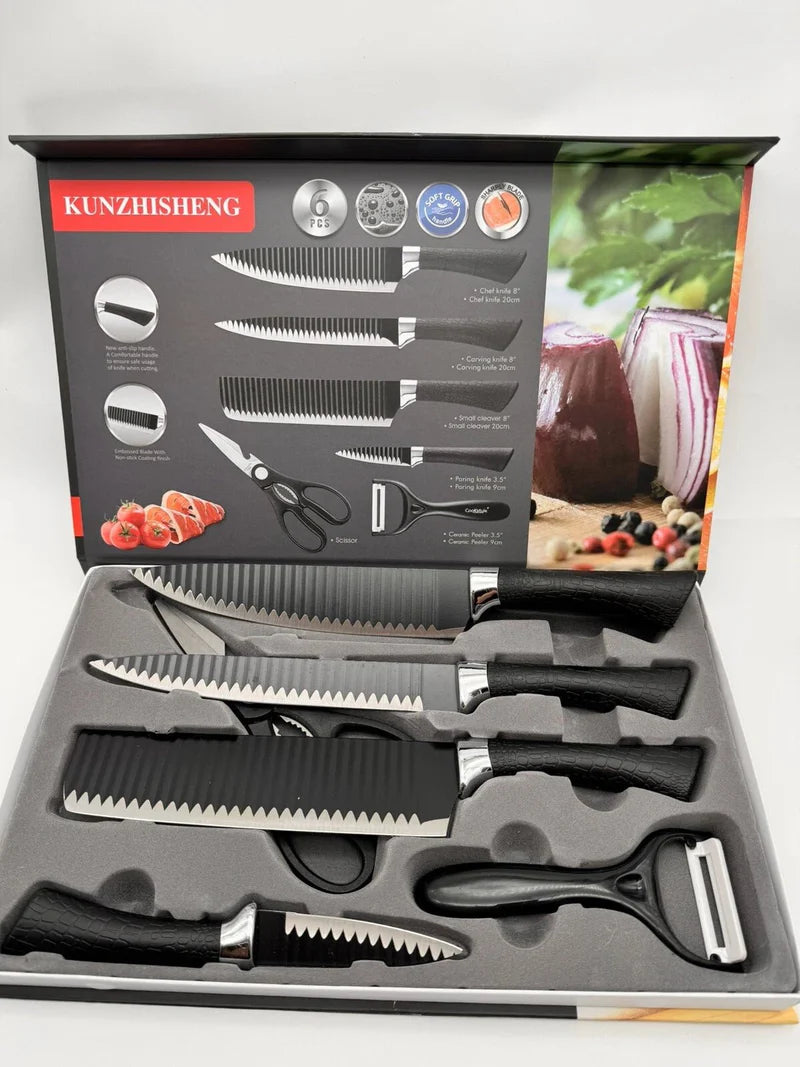 KUNZHISHENG 6-Piece Knife Set is a complete kitchen solution designed for everyday cooking needs. Featuring sharp stainless steel blades, ergonomic soft-grip handles, and multiple knife types, this set ensures precision cutting, durability, and comfort for both home cooks and professionals.